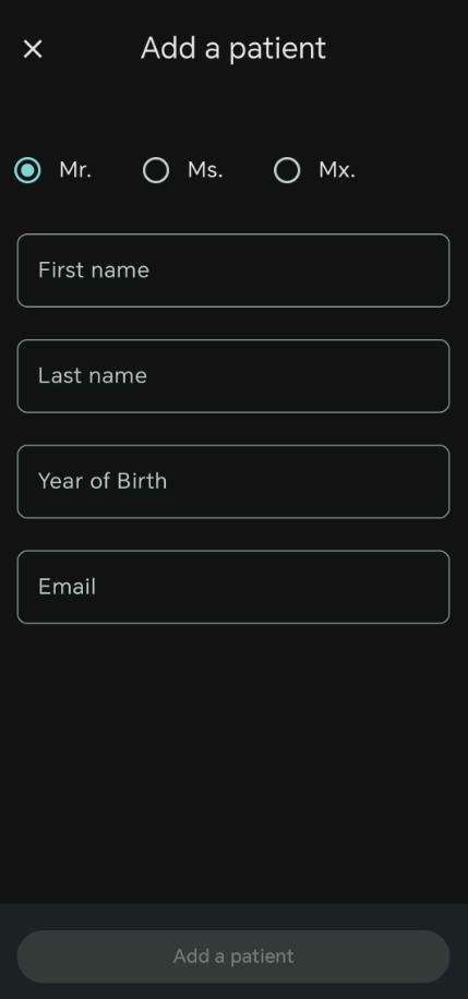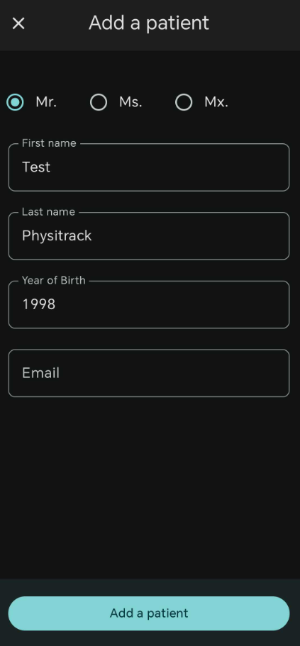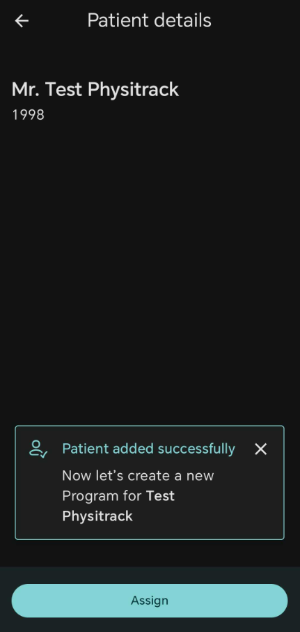 - Once completed tap on "Add patient" and the patient will be created and ready to be assigned an exercise.
