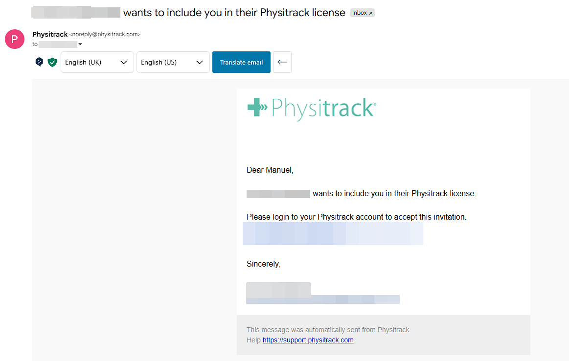 Once added, your colleague will automatically receive an email invitation. This email lets them know they’ve been included in your Physitrack subscription.