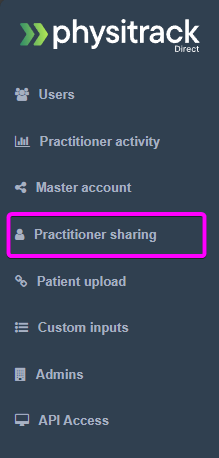 1. When logged in to the PT Direct admin site, select ' Practitioner sharing' from the left-hand menu.