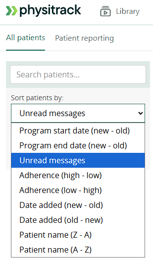 Tip: You can sort the patient list so that patients with unread messages are at the top. To do this, select the Unread messages option from the Sort patients by: drop-down menu to the left of the patient list.