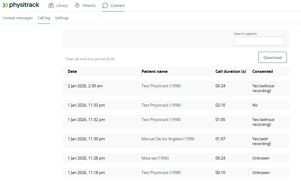 Opening the "Connect" menu and selecting the "Call log" tab at the top of your page opens up the full log of Physitrack Telehealth calls in your caseload.