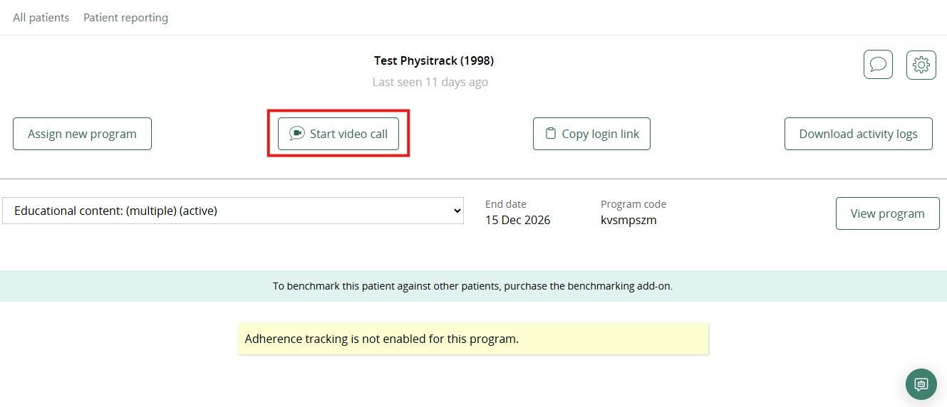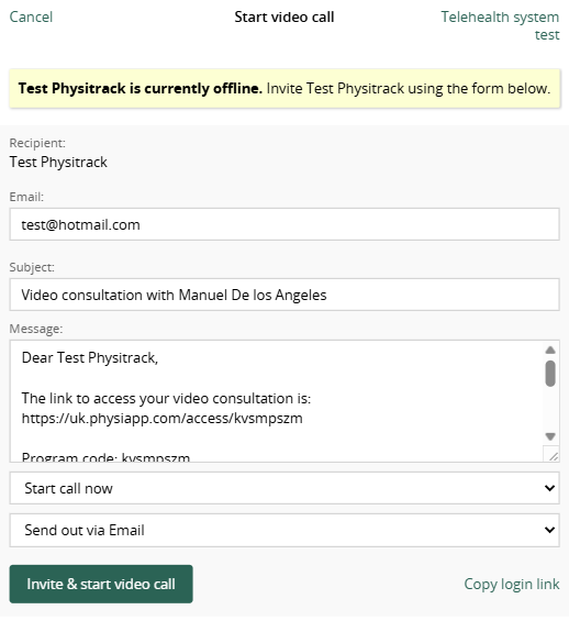 After you have selected a patient, click the "Start video call" button. If a client’s email address is provided in their Physitrack client account, you can send on-boarding instructions prior to the call.