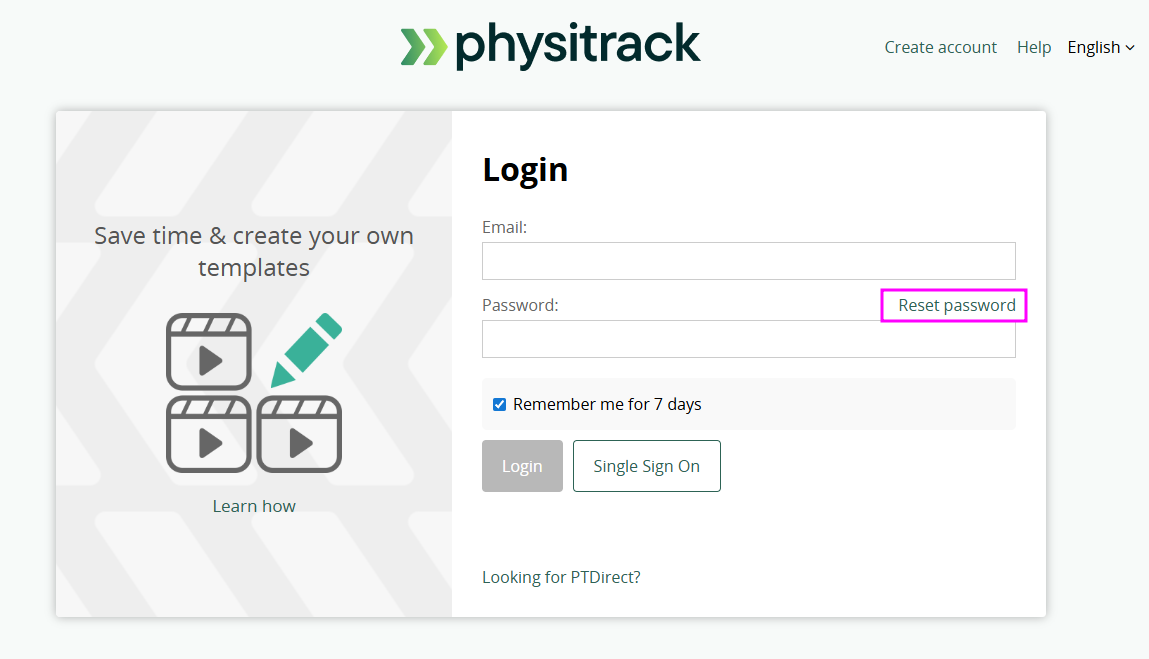 Important: After PT Direct and Physitrack account unification, there is only one login page. This page is used to log in and reset both the admin password and practitioner access password. If you have an account with both admin and practitioner access, you only have one password.