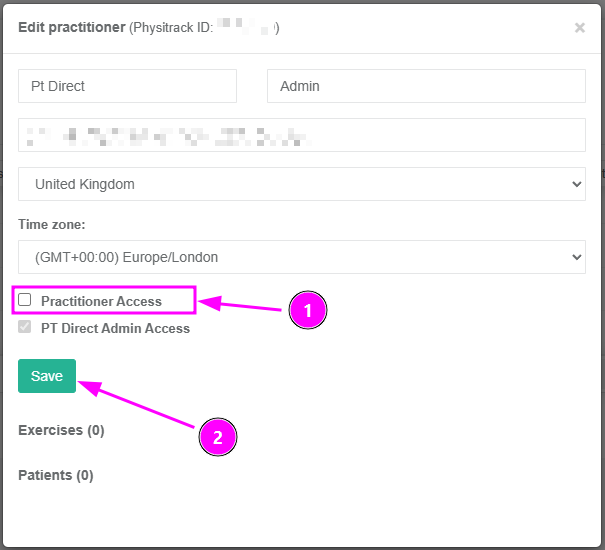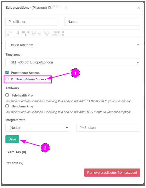 It is now possible to promote a regular Physitrack practitioner user within the PT Direct account to an admin role. Just open the practitioner record in the Practitioners tab, click to enable "PT Direct Admin Access" and then click Save to close the view. Now the user will see the "PT Direct" option in their menu when they click their name.