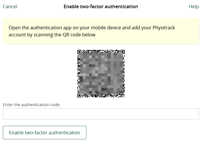Öffnen Sie nun Ihre Authentifizierungs-App und fügen Sie Ihr Physitrack-Konto hinzu, indem Sie den QR-Code auf Ihrem Bildschirm scannen. Geben Sie den von der App generierten Code auf der Website ein und bestätigen Sie durch Klicken auf die Schaltfläche „Zwei-Faktor-Authentifizierung aktivieren“.
