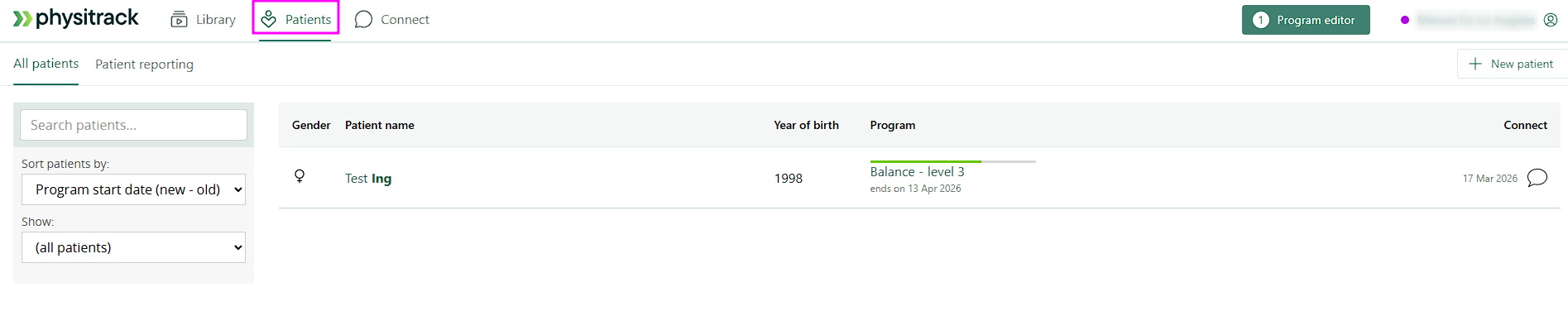 Beispiel: Testpatient 2 - Patienten, denen noch kein Trainingsprogramm zugewiesen wurde, haben unter dem Namen in grauer Kursivschrift „Kein Programm “.