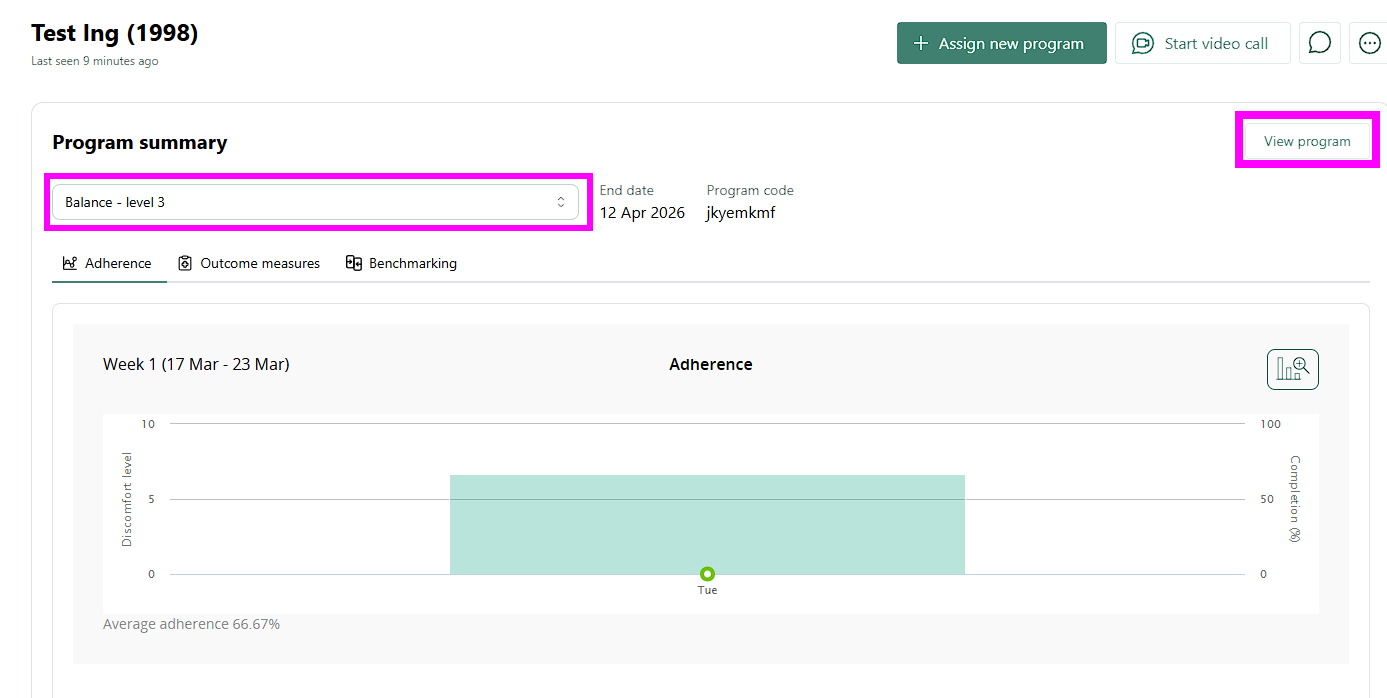- Wählen Sie das Trainingsprogramm aus dem Dropdown-Menü aus (falls diesem Patienten mehr als ein Trainingsprogramm zugewiesen ist) und klicken Sie auf die Schaltfläche„Programm anzeigen“. Dadurch wird das Trainingsprogramm im Programmeditor geöffnet.