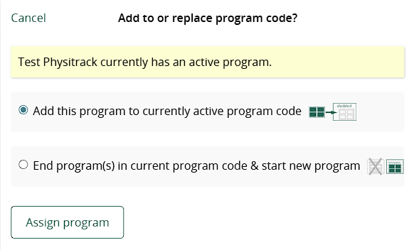 - Klicken Sie auf die Schaltfläche Neues Programm zuweisen . Sie werden nun gefragt, ob Sie das neue Trainingsprogramm zu dem bereits bestehenden Programm hinzufügen oder das bestehende Trainingsprogramm ersetzen möchten. Wählen Sie die erste Option - Dieses Programm zum bereits bestehenden Programmcode hinzufügen und fahren Sie fort.