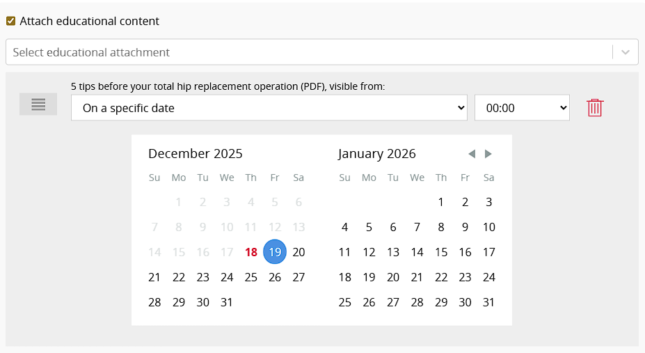 Für jedes pädagogische Attachment, das Sie einem Trainingsprogramm hinzufügen, können Sie festlegen, wann es im Trainingsprogramm eines Kunden sichtbar wird.