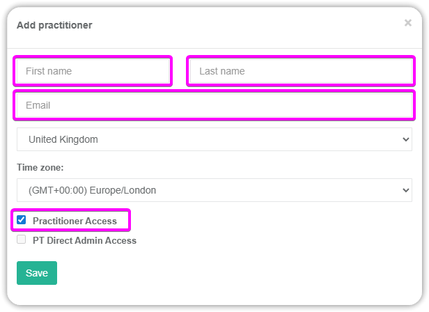 - Enter the details of the practitioner you want to add to PT Direct and click Save when done.
