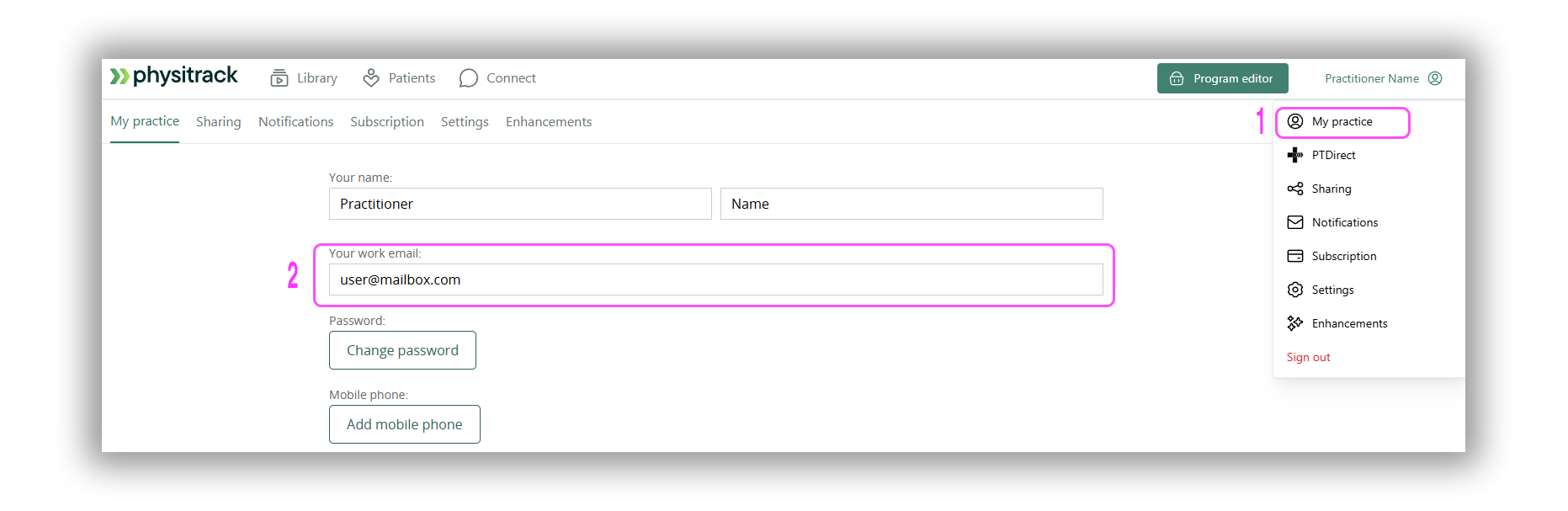 - Sähköpostiosoitteesi on myös Physitrack-tunnuksesi. Päivitä se etu- ja sukunimesi alla olevaan kenttään ja napsauta sitten sivun alareunassa olevaa Tallenna muutokset -painiketta.