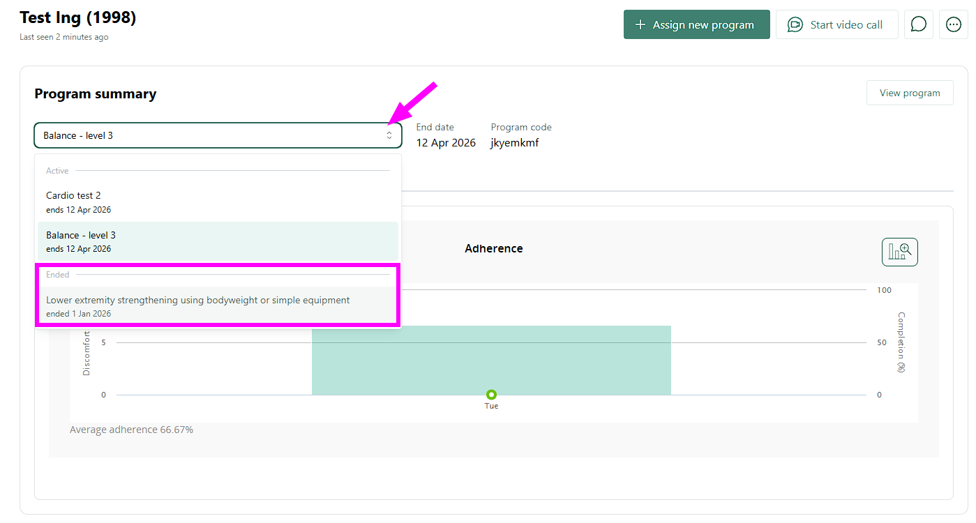 Päättyneitä harjoitusohjelmia voi edelleen tarkastella - sekä potilas PhysiAppin kautta että sinä Physitrack-tilisi kautta. Tällä sivulla kerrotaan, miten voit tarkastella päättynyttä harjoitusohjelmaa.