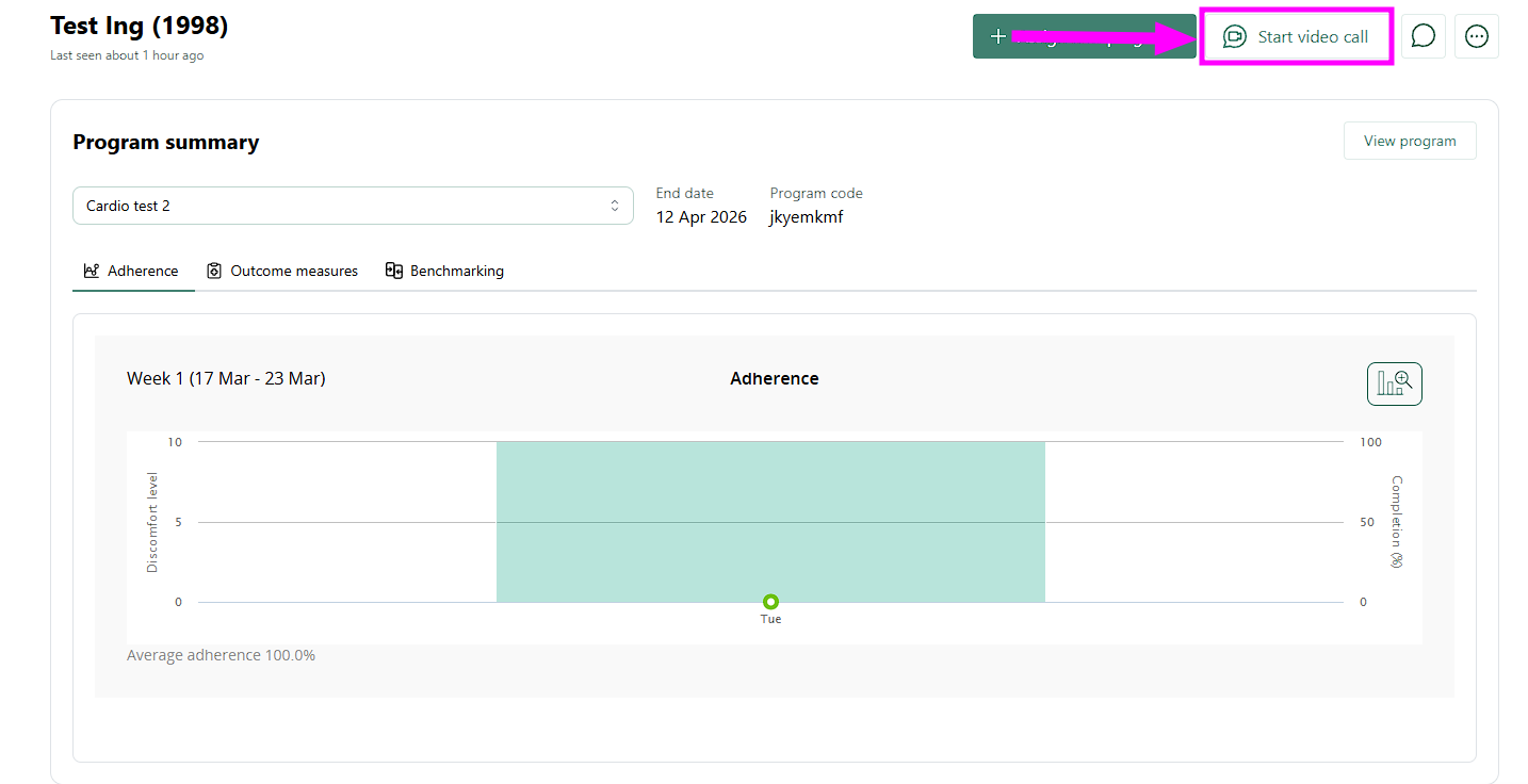 Après avoir sélectionné un patient, cliquez sur le bouton «Démarrer l'appel vidéo ». Si l'adresse e-mail d'un client est indiquée dans son compte client Physitrack, vous pouvez lui envoyer des instructions d'intégration avant l'appel.