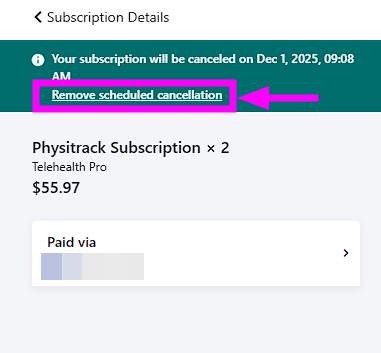 Fare clic sul pulsante verde Annullamento della cancellazione nella pagina dell'abbonamento, quindi fare clic su"Rimuovi cancellazione programmata" per annullare la cancellazione. L'abbonamento verrà rinnovato normalmente, come se la cancellazione non fosse avvenuta.