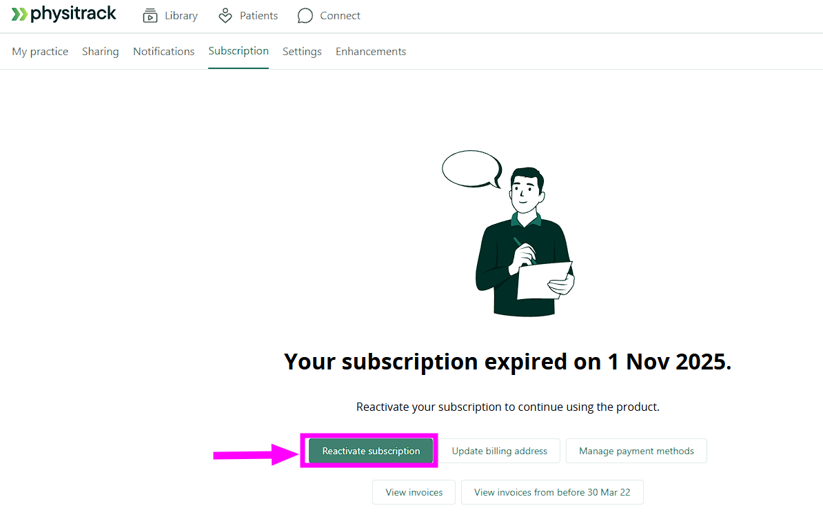 Quando accedete al vostro account Physitrack, vedrete la pagina seguente. Cliccate su Riattiva abbonamento. Se sul vostro conto è presente un metodo di pagamento valido, l'abbonamento verrà riavviato automaticamente. Non avete un metodo di pagamento valido? In tal caso, contattateci.