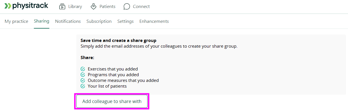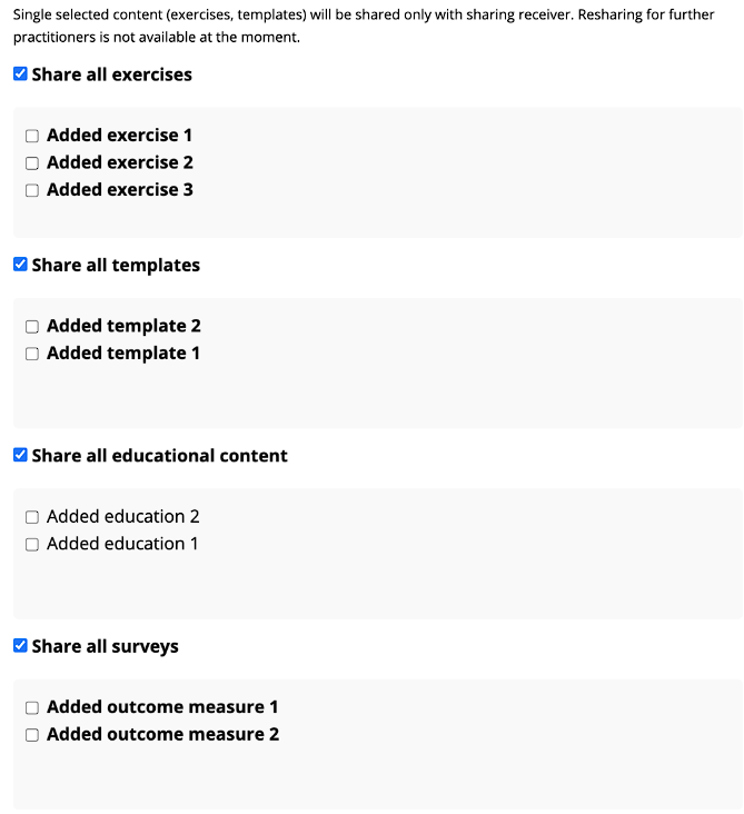 Als u ervoor kiest om inhoud te delen, gaat Physitrack ervan uit dat u alle toegevoegde inhoud wilt delen met uw collega. Je hebt echter ook de mogelijkheid om specifieke oefeningen, programma's, lesmateriaal en vragenlijsten te delen.