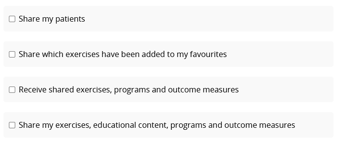 Selecteer wat je wilt delen met je collega: je patiënten, favoriete oefeningen of je eigen toegevoegde oefeningen, sjablonen, educatieve inhoud en uitkomstmaten. Als je gedeeld materiaal van deze collega wilt ontvangen, selecteer dan (ook) de optie Gedeelde oefeningen, programma's en uitkomstmaten ontvangen.