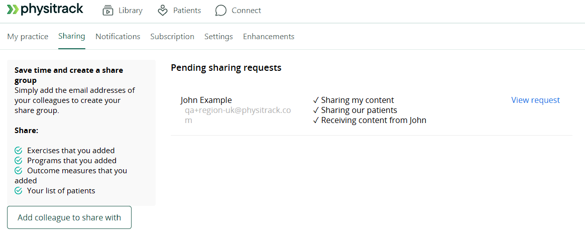 Je ziet nu dat je collega een verzoek tot delen heeft ingediend. De collega in kwestie ontvangt een melding per e-mail en kan het verzoek om delen accepteren op dezelfde pagina in zijn account. Pas als het verzoek om delen is geaccepteerd, worden patiënten en inhoud gedeeld.