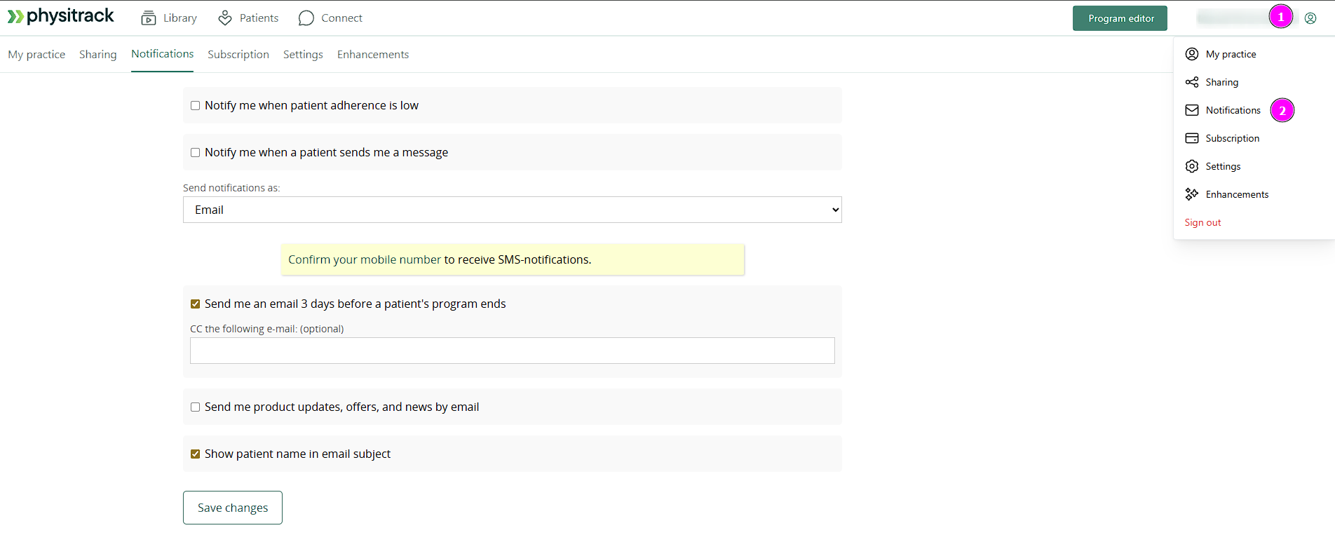 Physitrack umożliwia dostosowanie powiadomień otrzymywanych od grupy pacjentów. Aby uzyskać do nich dostęp, należy kliknąć swoje imię w prawym górnym rogu i wybrać opcję Powiadomienia.