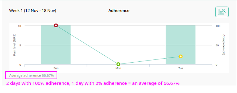 Jeśli przydzielono pacjentowi program ćwiczeń obejmujący łącznie 10 ćwiczeń dziennie, a pacjent wykonywał 8 ćwiczeń dziennie w ciągu ostatniego tygodnia, średni wskaźnik przestrzegania zaleceń wyniesie 80%.